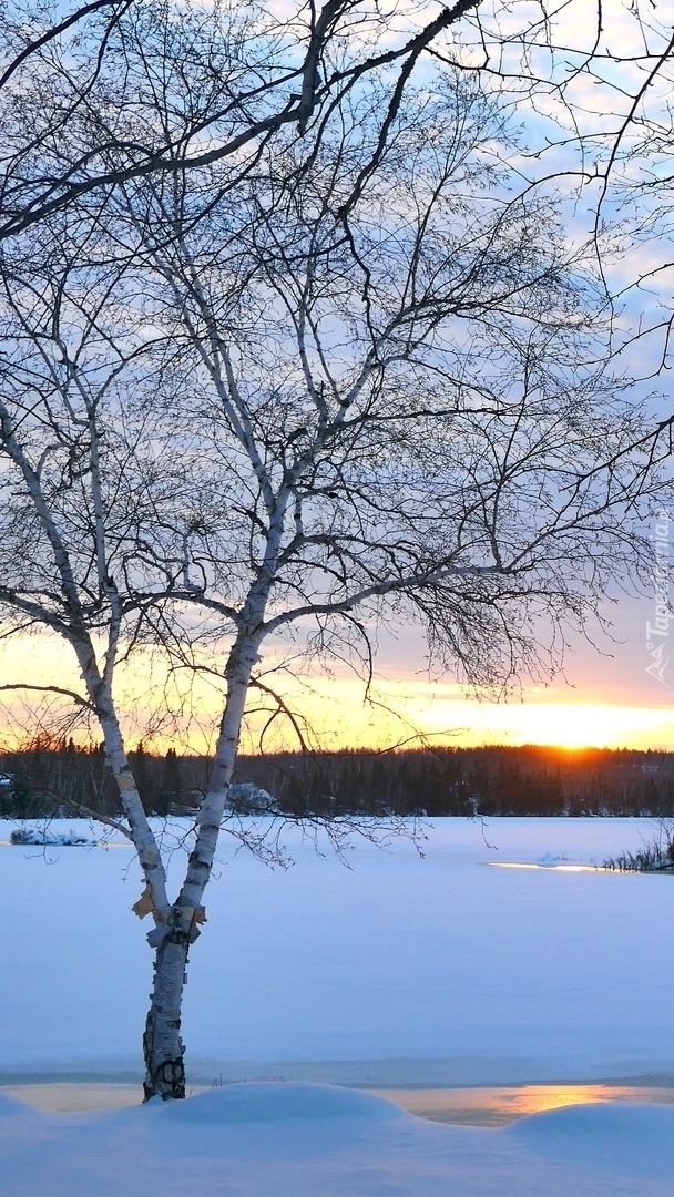 Edytor tapety: Brzoza nad ośnieżonym jeziorem