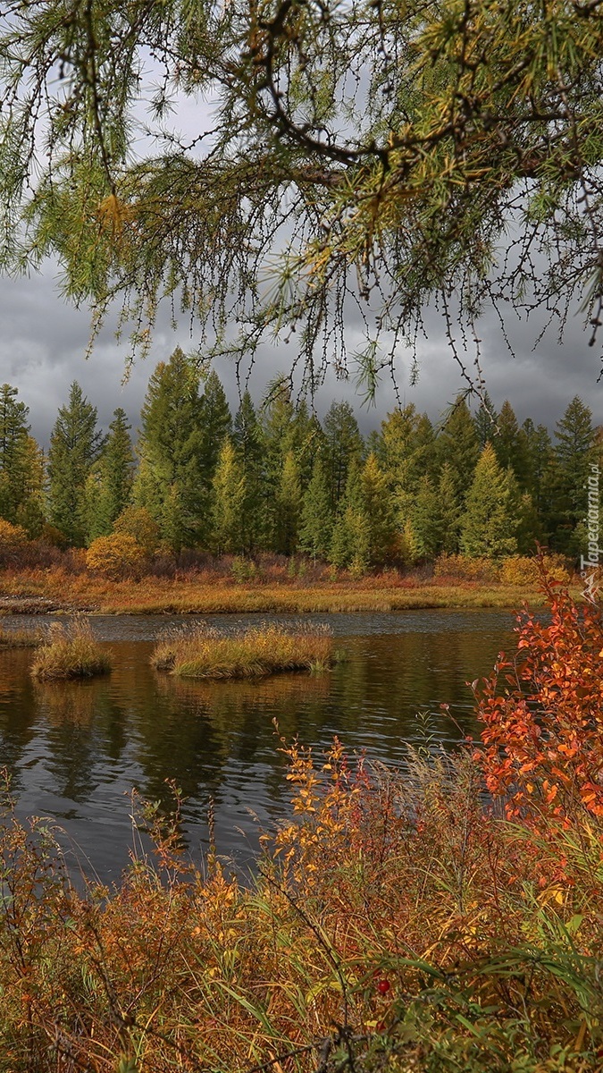 Edytor tapety: Kolorowa roślinność nad brzegiem rzeki