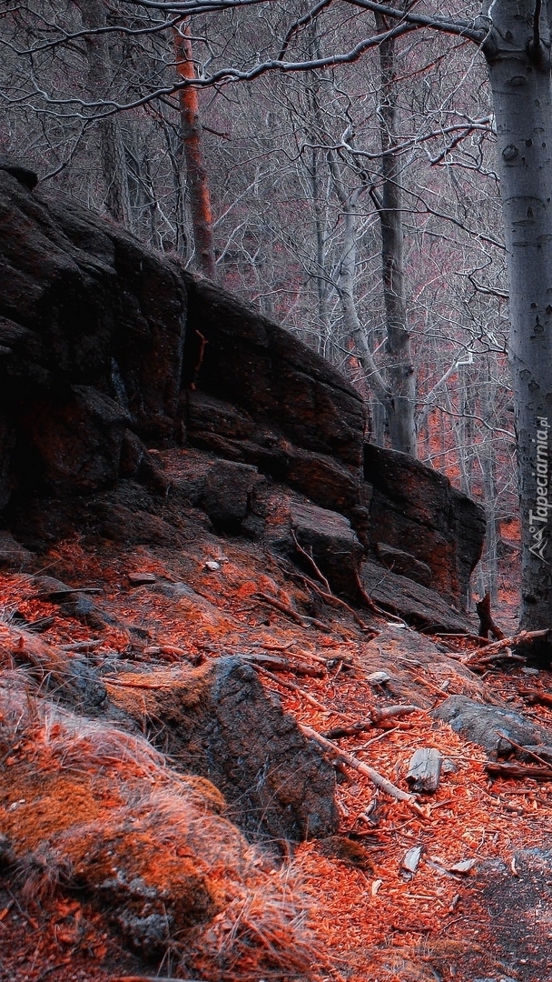Edytor tapety: Czerwone liście pod skałami w lesie