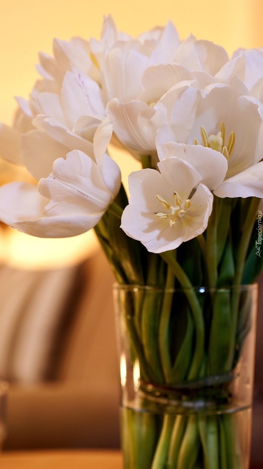 Edytor tapety: Bukiet białych tulipanów w szklanym wazonie