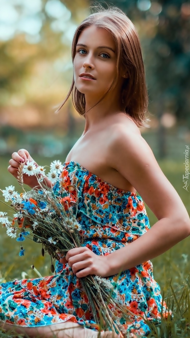 Edytor tapety: Kobieta z bukietem polnych kwiatów