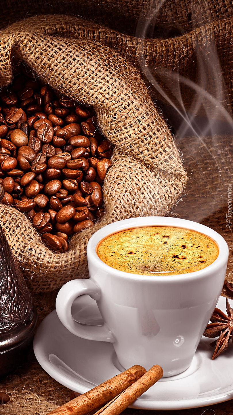 Edytor tapety: Filiżanka kawy obok worka z ziarnami