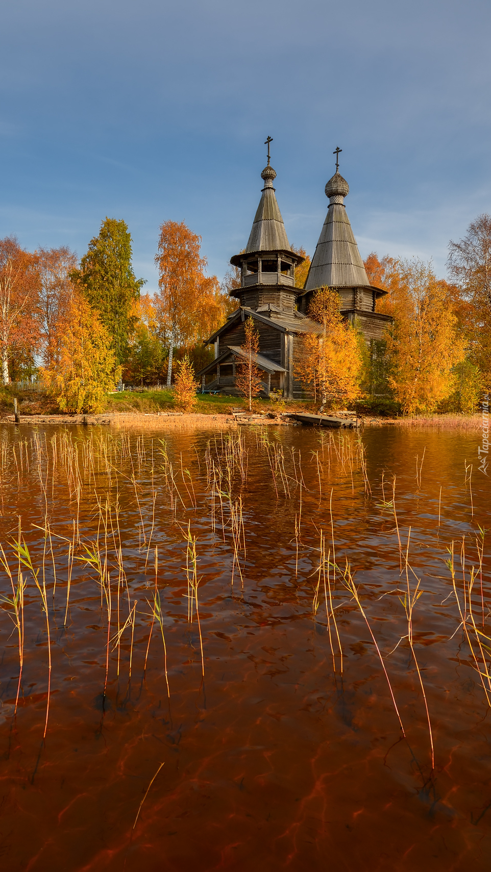 Edytor tapety: Cerkiew wśród jesiennych drzew nad jeziorem