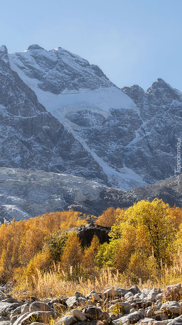 Edytor tapety: Jesienne drzewa na tle gór