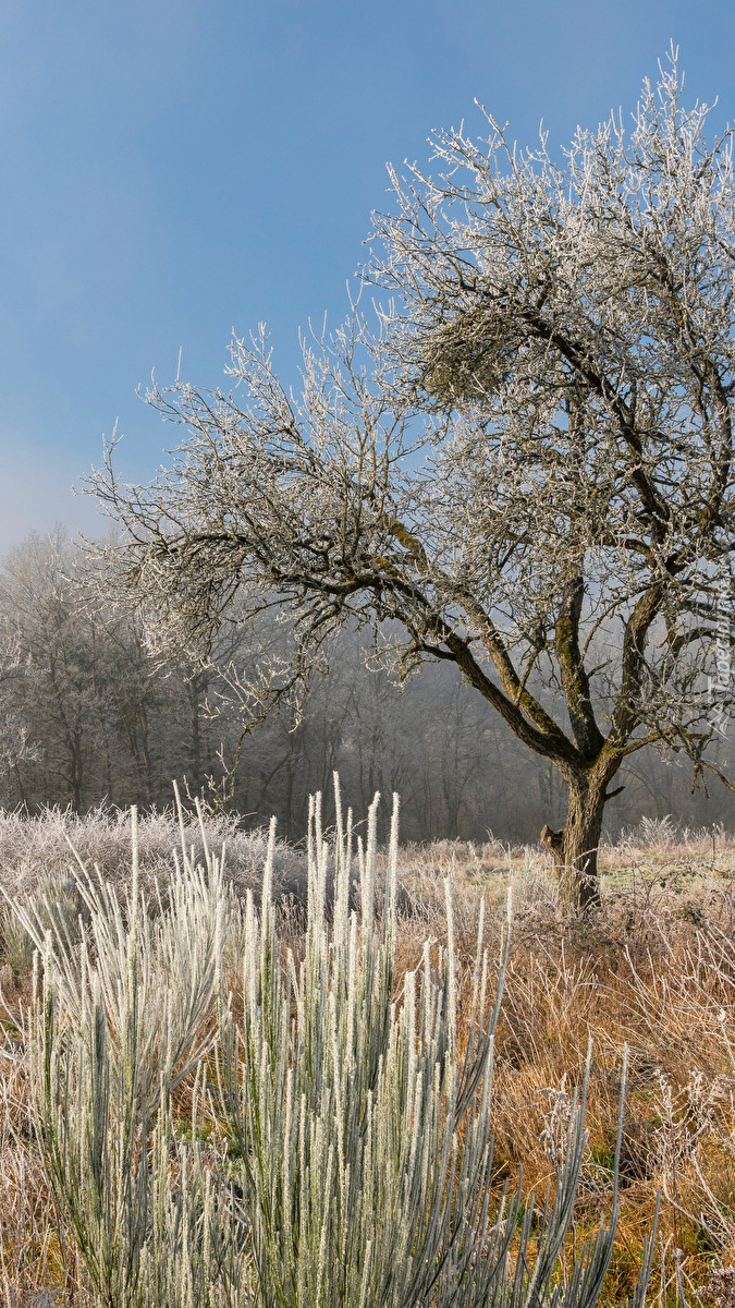 Edytor tapety: Oszronione drzewa i trawa na łące