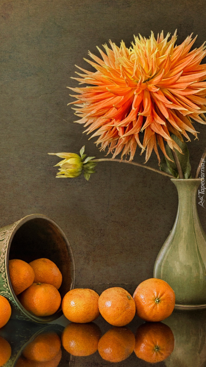 Edytor tapety: Dalie w wazonie obok mandarynek