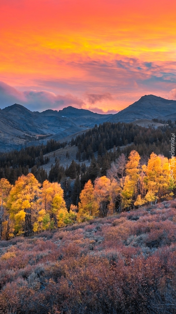 Edytor tapety: Pożółkłe drzewa na tle gór