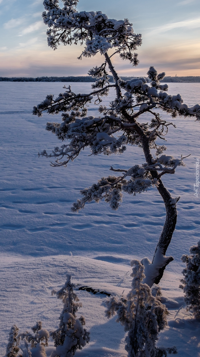 Edytor tapety: Ośnieżona sosna nad jeziorem