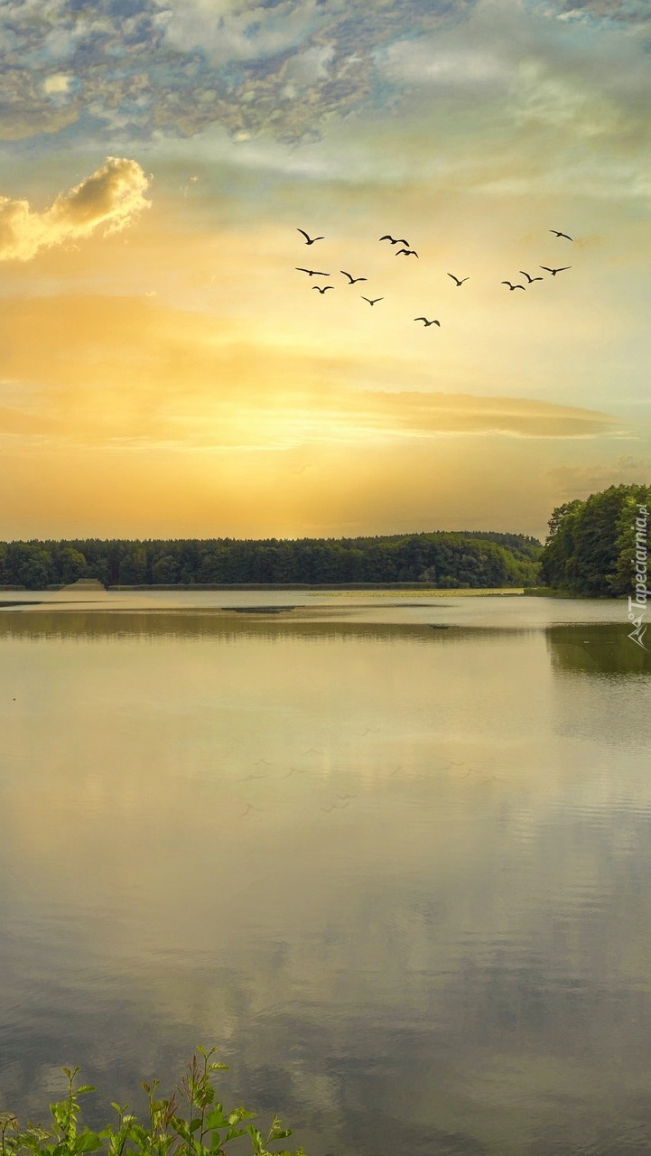 Edytor tapety: Ptaki nad jeziorem o poranku