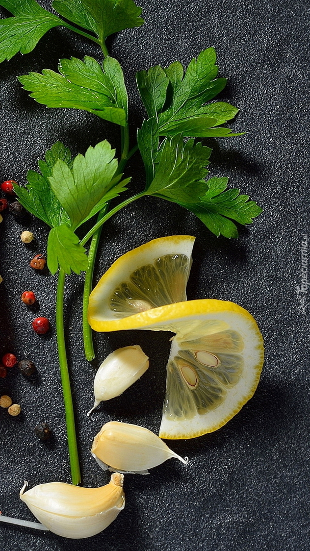 Edytor tapety: Czosnek i cytryna obok natki pietruszki