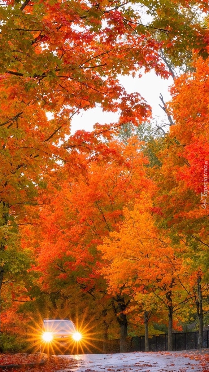 Edytor tapety: Samochód na drodze pod jesiennymi drzewami