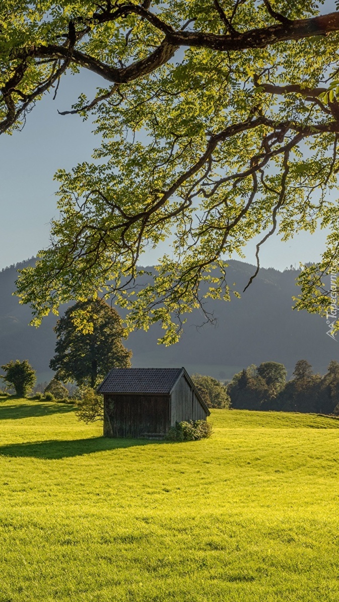 Edytor tapety: Drzewa i szopa na łące