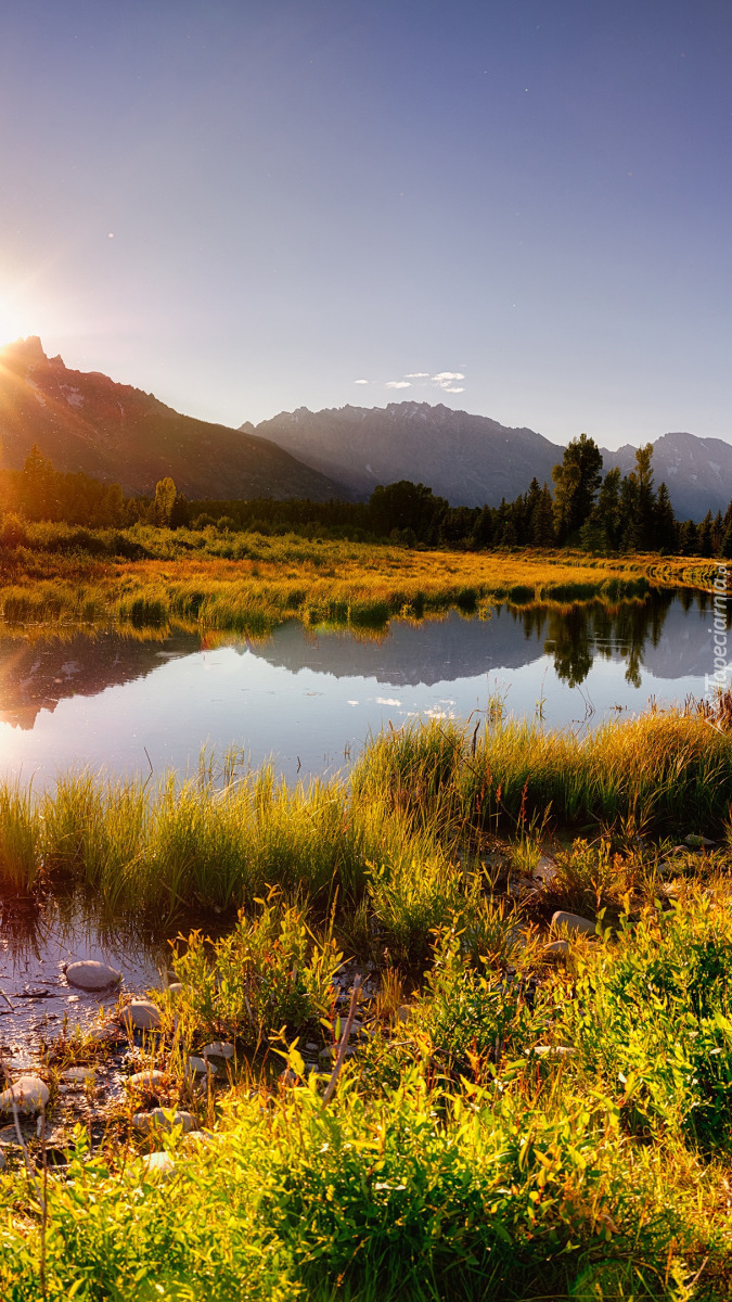 Edytor tapety: Trawy i kamienie nad jeziorem
