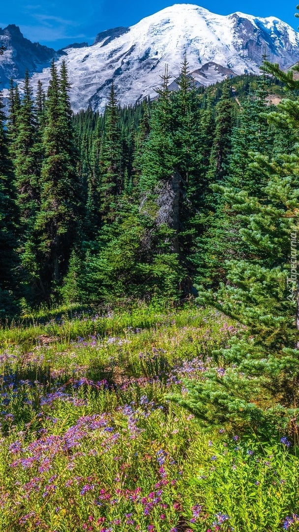 Edytor tapety: Świerki na tle ośnieżonych gór