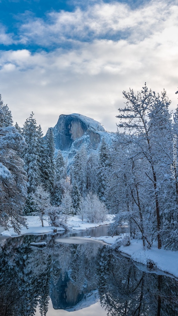 Edytor tapety: Ośnieżone drzewa nad rzeką Merced