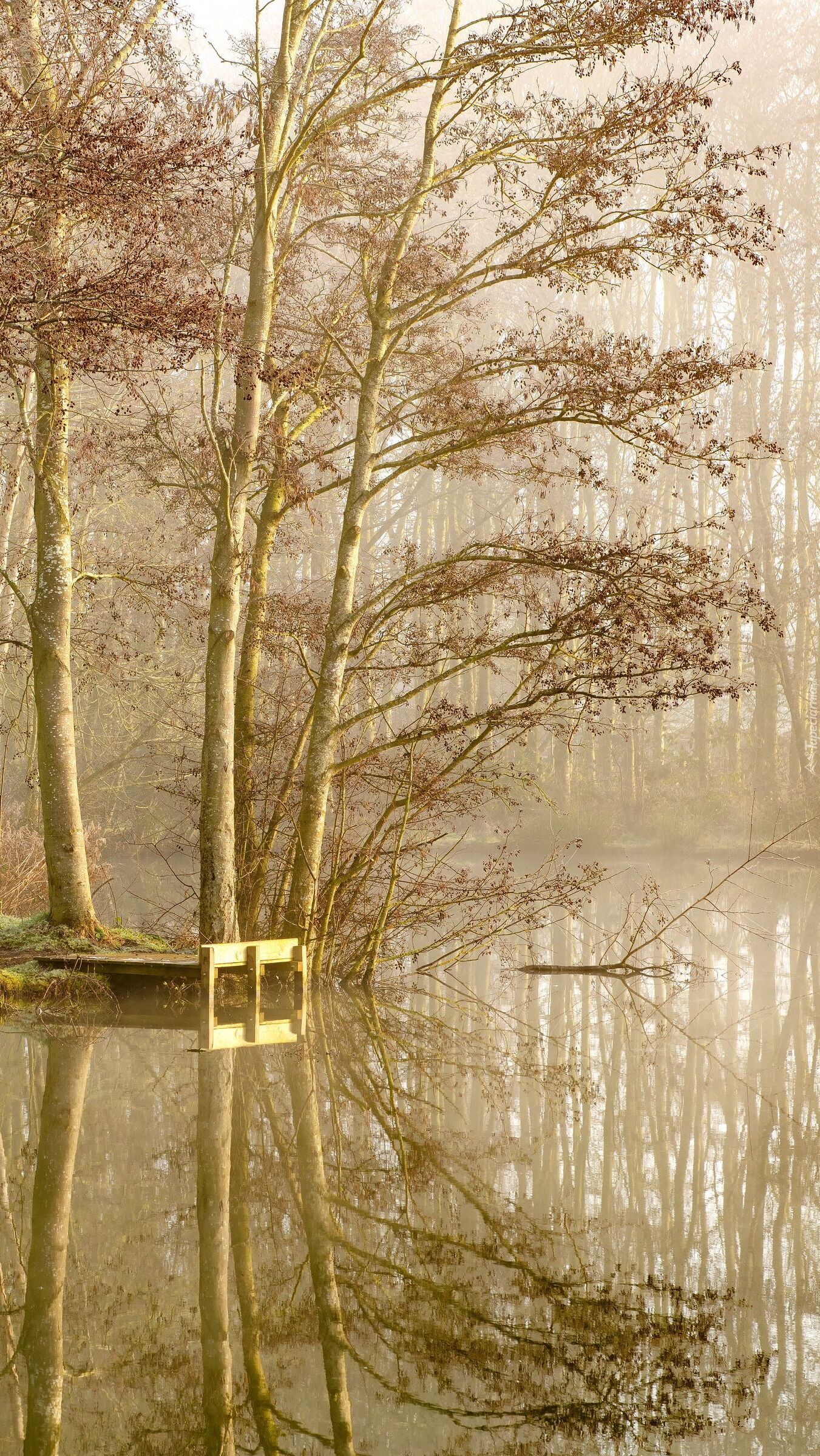 Edytor tapety: Drzewa we mgle nad jeziorem