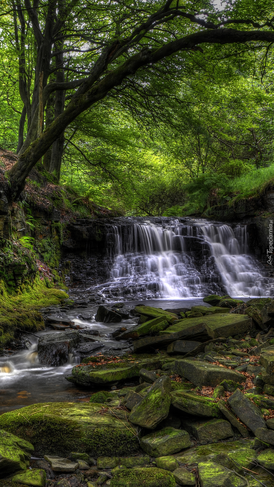 Edytor tapety: Drzewa na skarpie przy małym wodospadzie