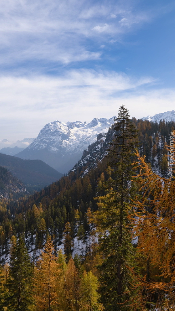 Edytor tapety: Jesienne drzewa na tle ośnieżonych Dolomitów