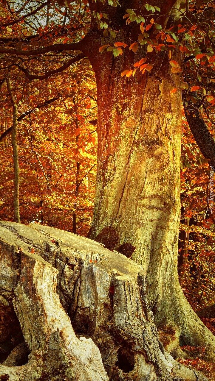 Edytor tapety: Jesienne drzewo i pniak w lesie