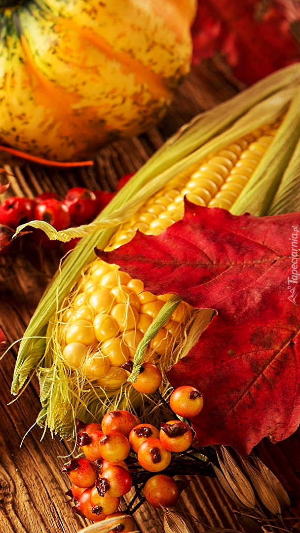 Edytor tapety: Kolba kukurydzy pod liściem klonu