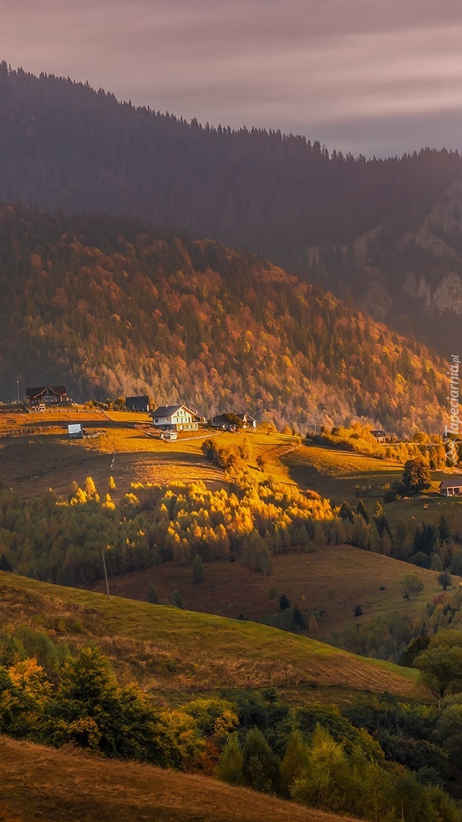 Edytor tapety: Domy na wzgórzu pod zalesionymi górami