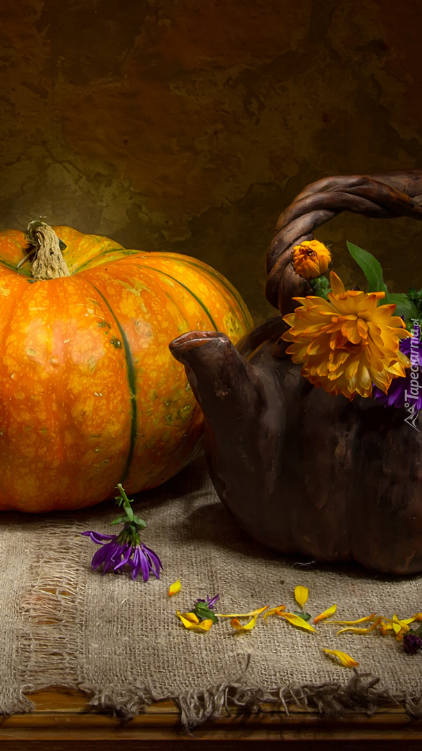 Edytor tapety: Kwiaty w czajniczku obok dyni