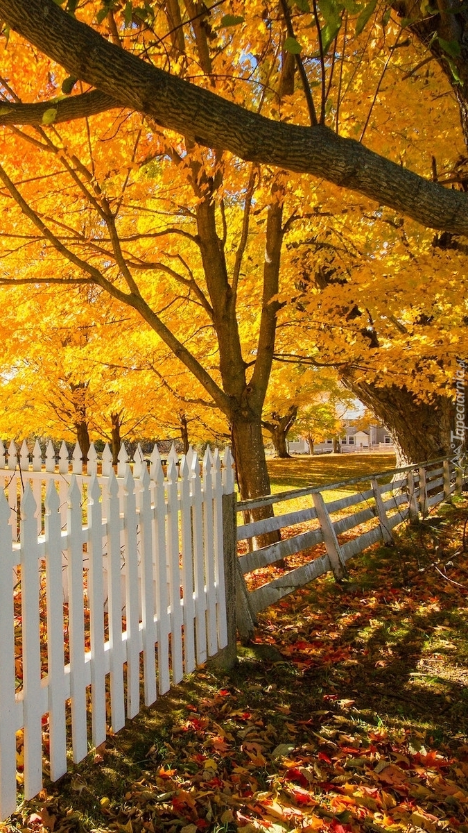 Edytor tapety: Jesienne drzewa przy białym płocie