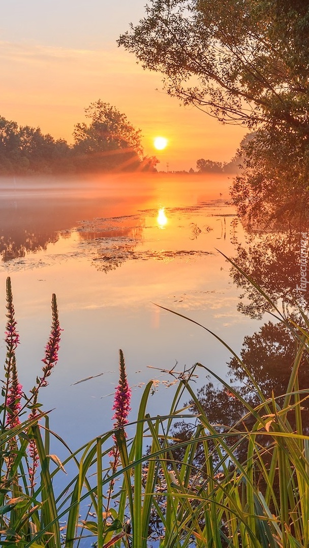 Edytor tapety: Wschód słońca nad zamglonym jeziorem