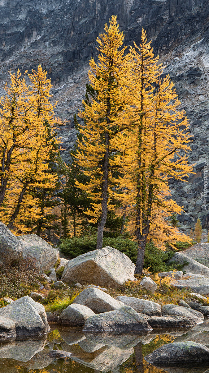 Edytor tapety: Jesienne drzewa na skałach nad wodą