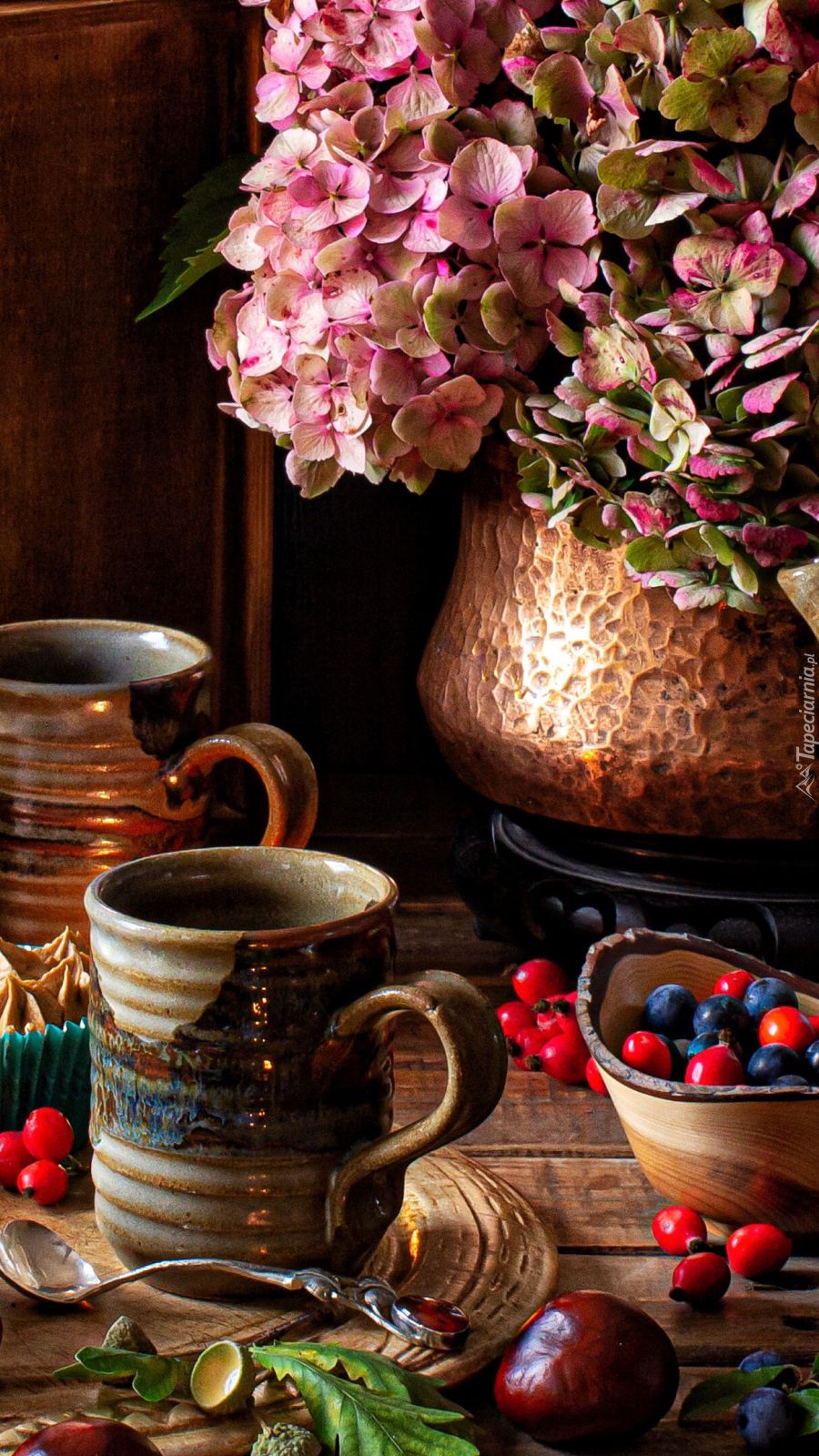 Edytor tapety: Hortensje w dzbanku obok kubka