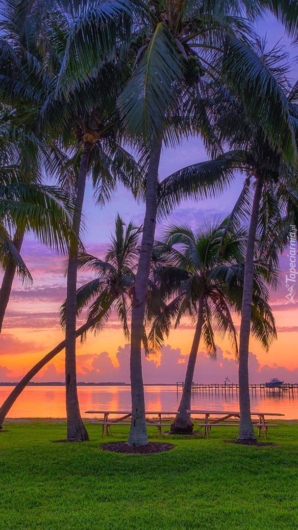 Edytor tapety: Ławki pod palmami nad morzem