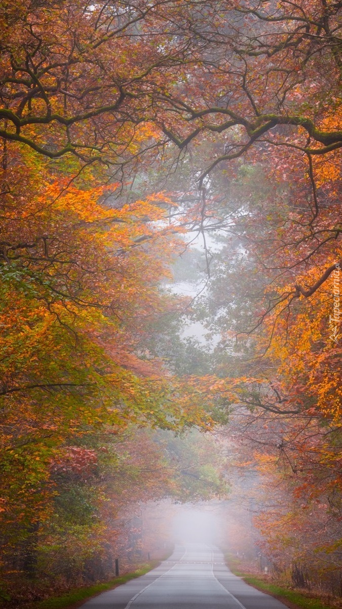 Edytor tapety: Jesienne drzewa przy zamglonej drodze