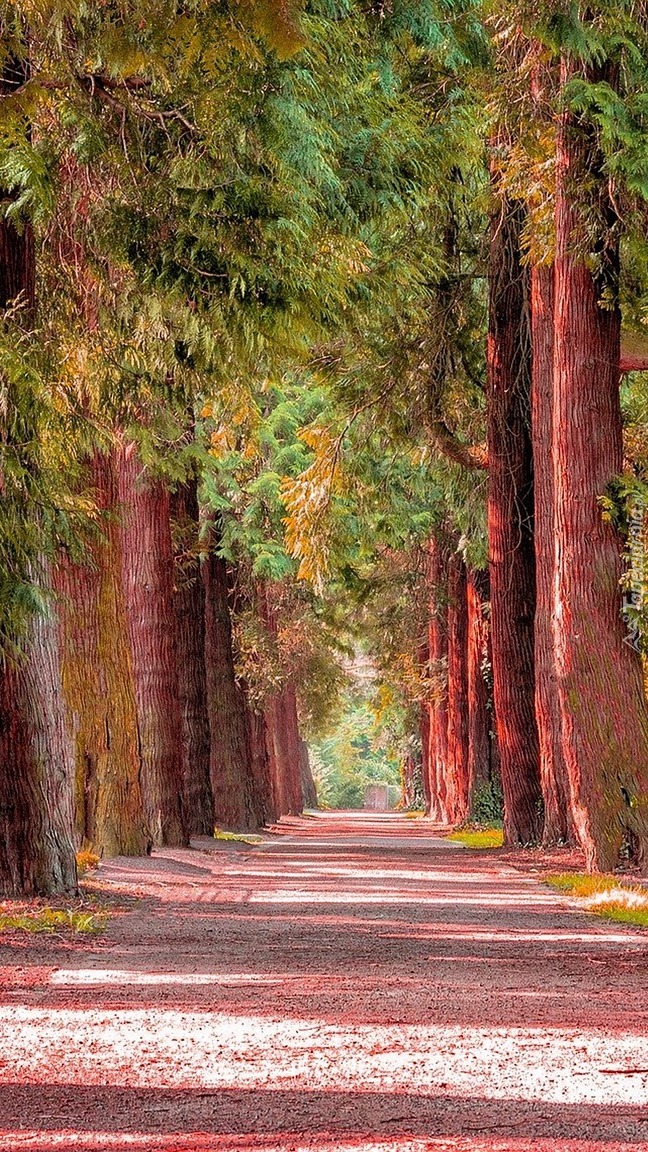Edytor tapety: Drzewa z czerwonymi pniami przy drodze