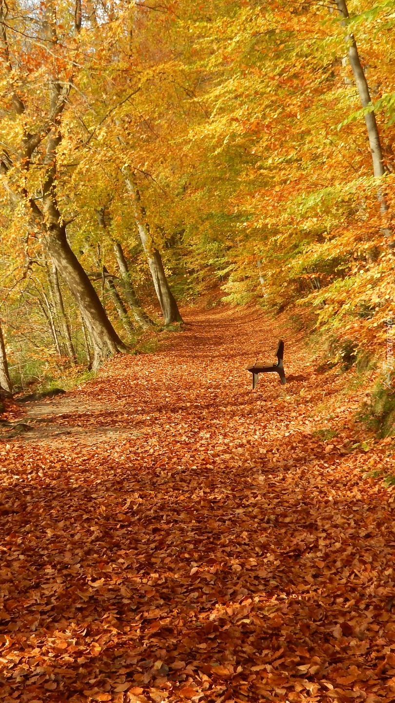 Edytor tapety: Ławka na ścieżce wśród jesiennych drzew