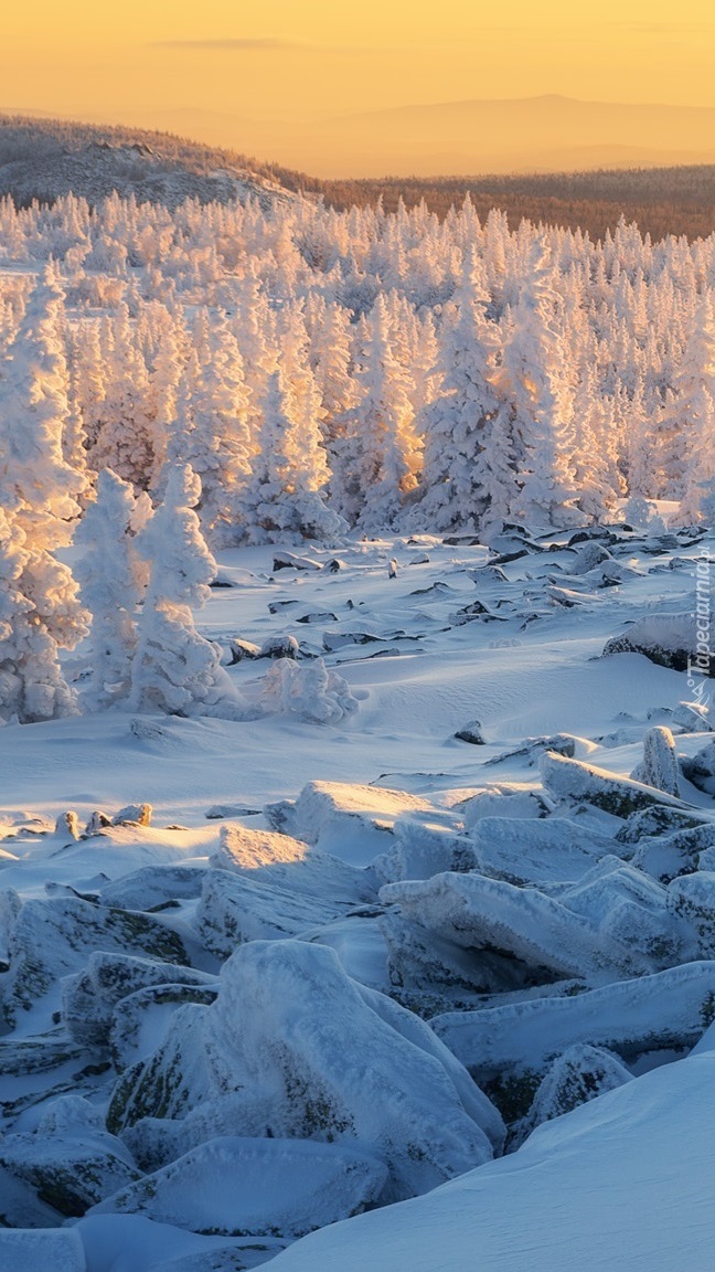 Edytor tapety: Ośnieżone drzewa w słonecznym blasku