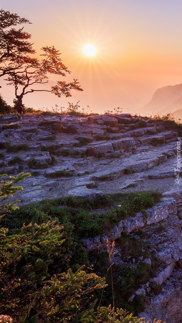 Edytor tapety: Drzewo na skałach o wschodzie słońca