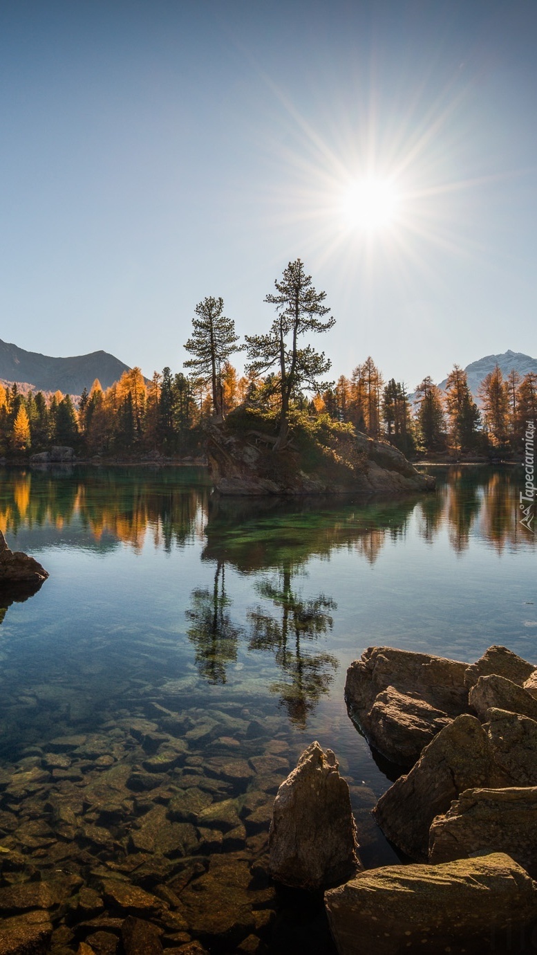 Edytor tapety: Rozświetlone drzewa i skały nad jeziorem