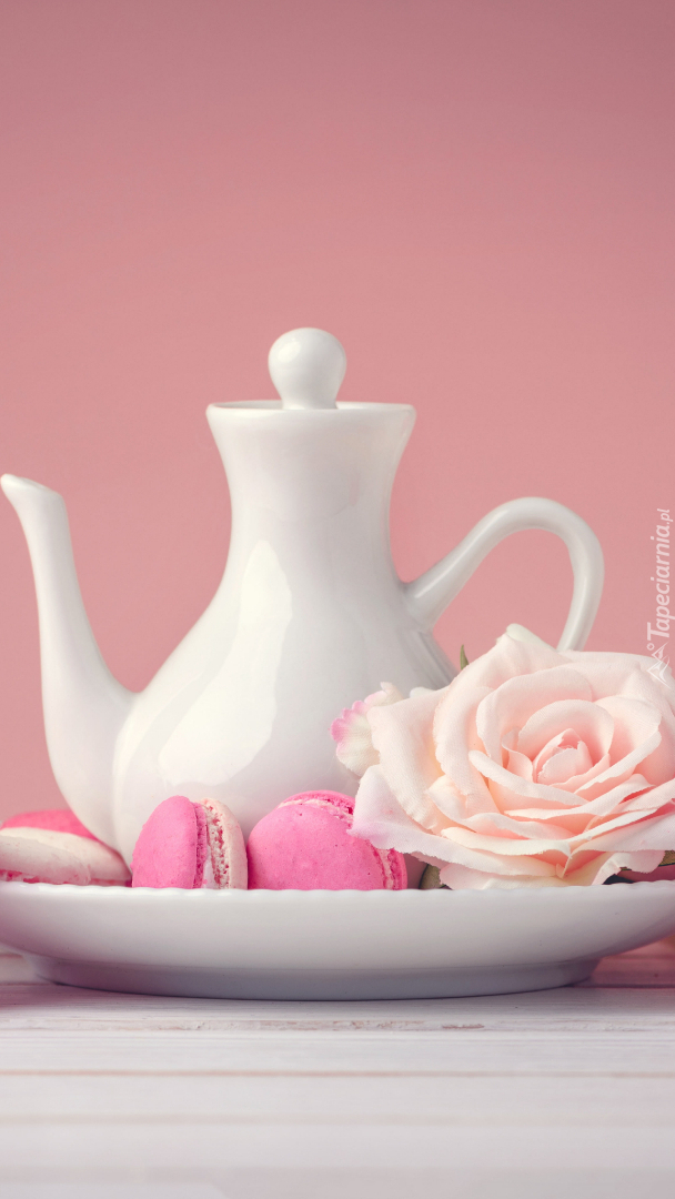 Edytor tapety: Różowe makaroniki i róża obok imbryka
