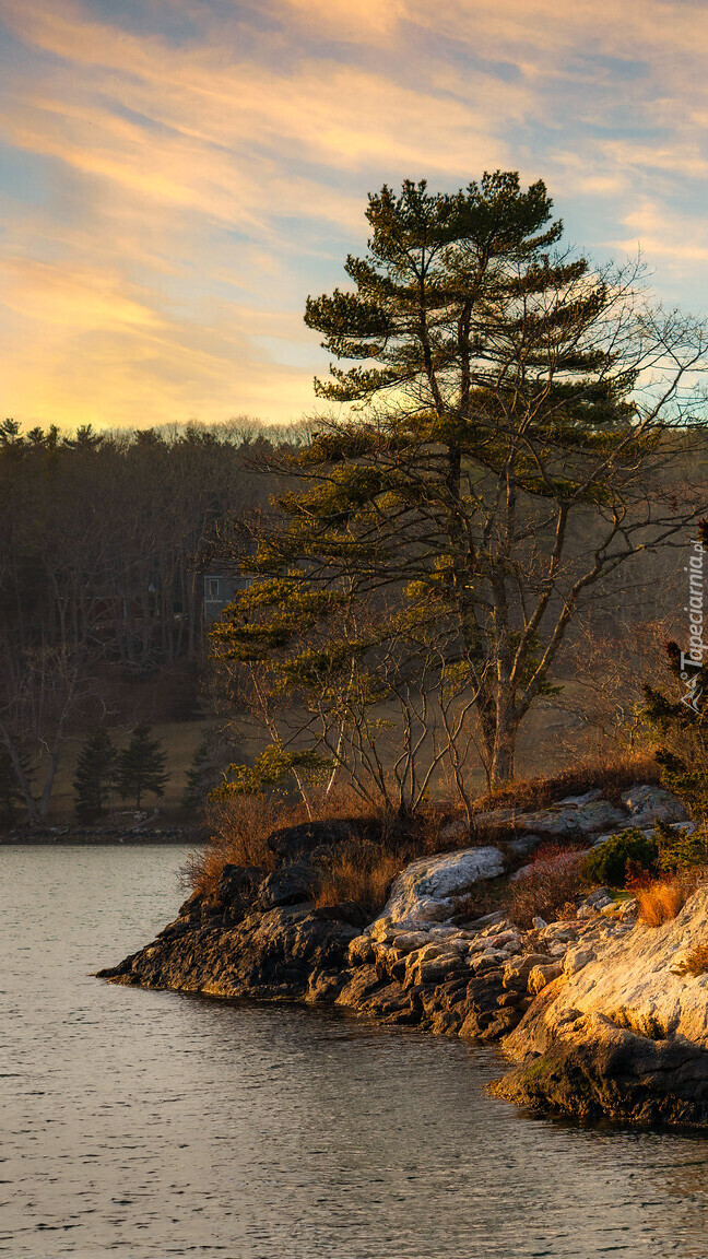 Edytor tapety: Drzewo na skałach nad jeziorem