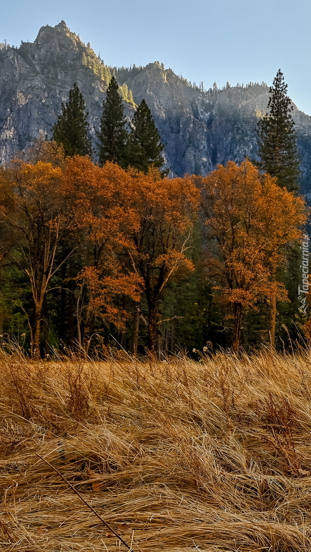 Edytor tapety: Jesienne drzewa na tle gór