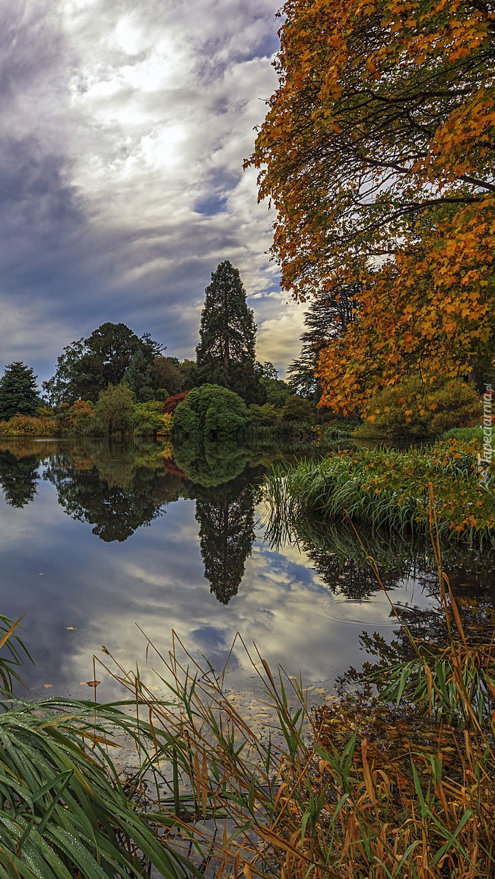 Edytor tapety: Pożółkłe drzewa i trawy nad jeziorem