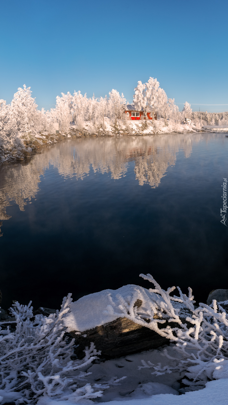 Edytor tapety: Dom pod ośnieżonymi drzewami nad jeziorem