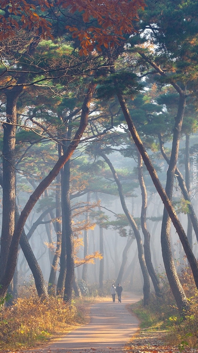 Edytor tapety: Pochylone drzewa nad zamgloną ścieżką