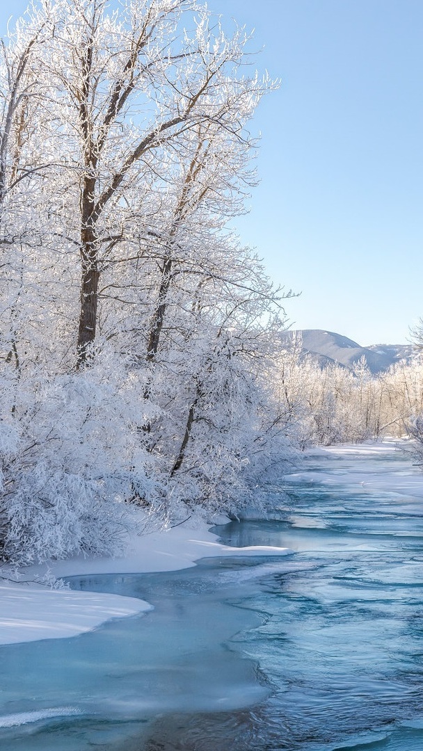 Edytor tapety: Ośnieżone drzewa na brzegu rzeki