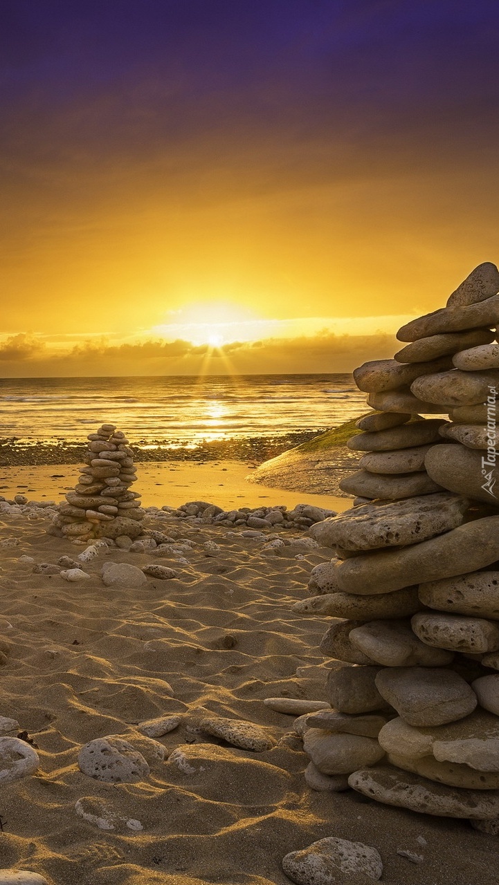 Edytor tapety: Kamienne piramidy z kamieni na plaży