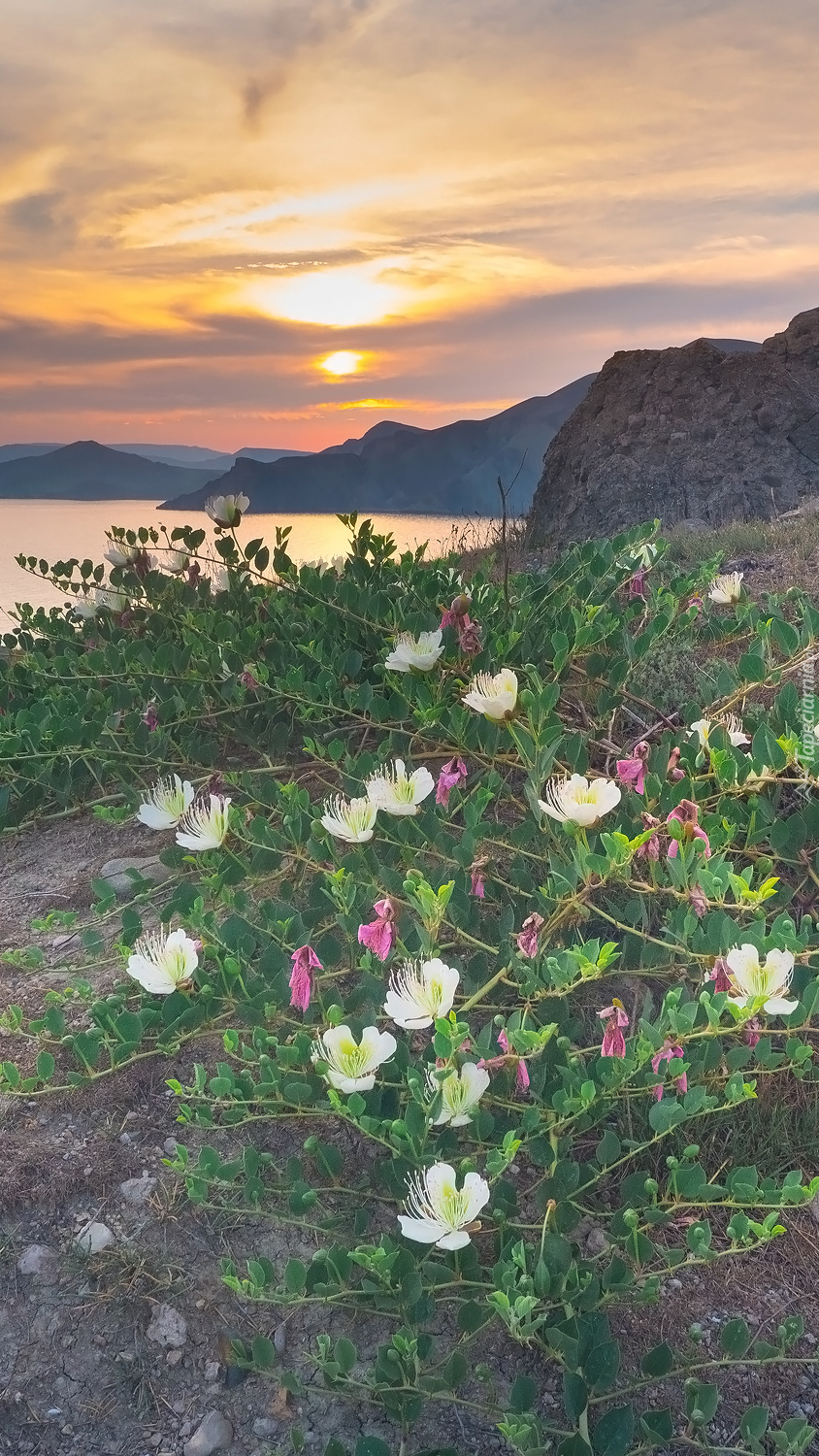 Edytor tapety: Kwiaty i skały nad jeziorem