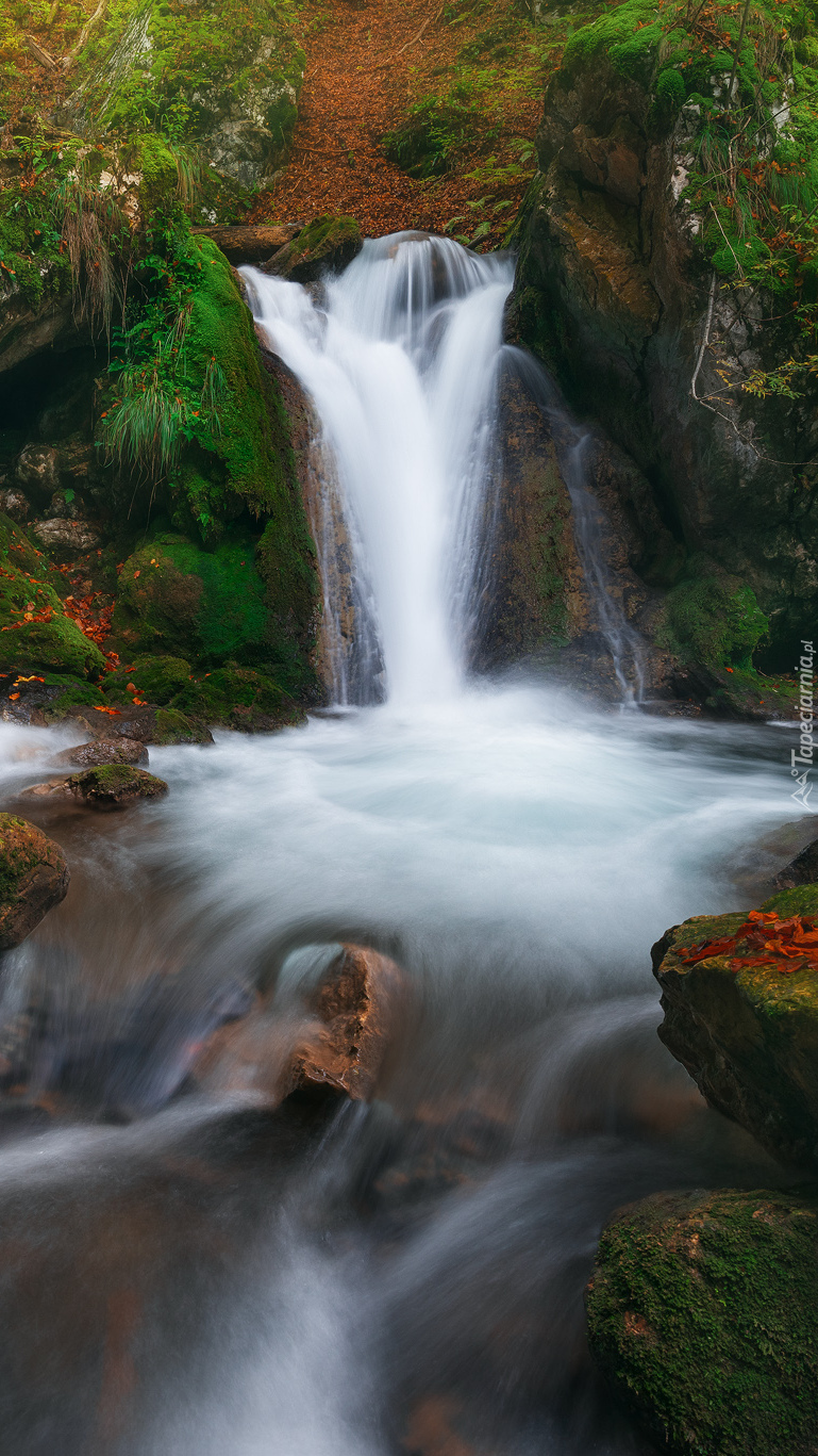 Edytor tapety: Wodospad wpadający do kamienistej rzeki