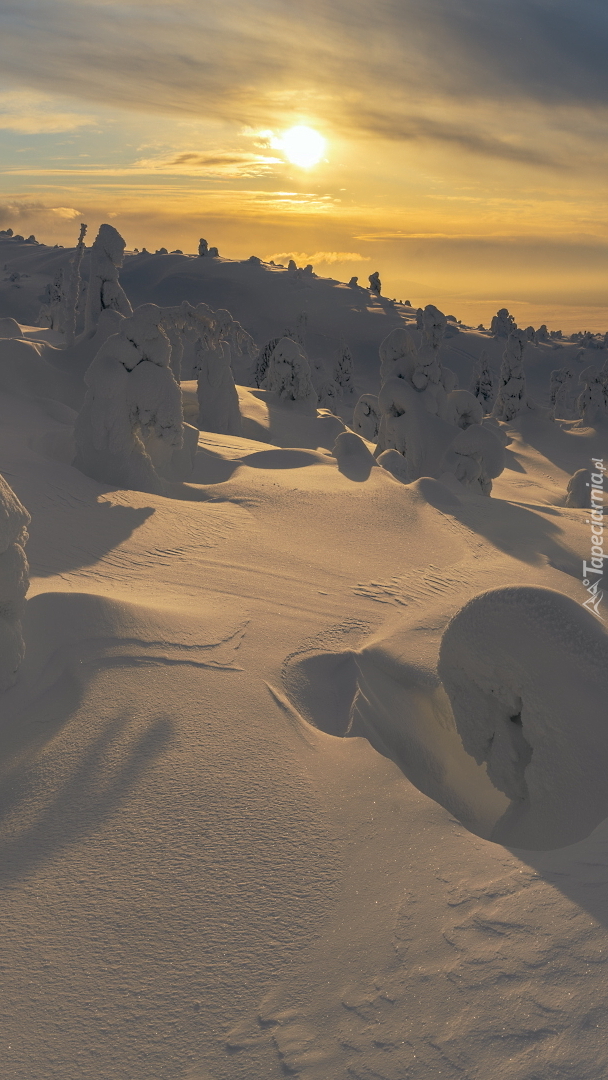 Edytor tapety: Zaśnieżone drzewa w blasku słońca