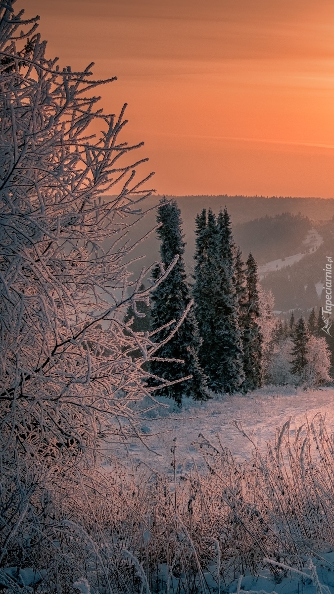 Edytor tapety: Oszronione drzewa o zachodzie słońca