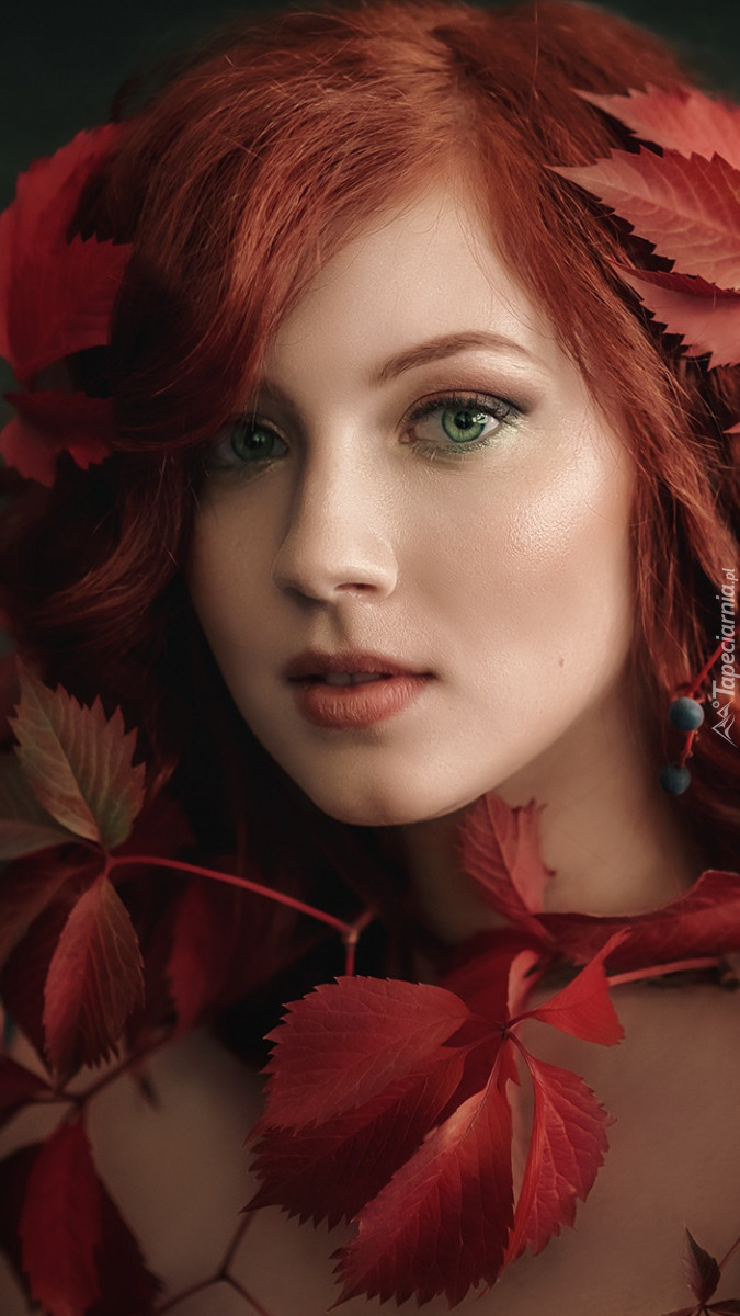Edytor tapety: Rudowłosa kobieta z liśćmi dzikiego wina
